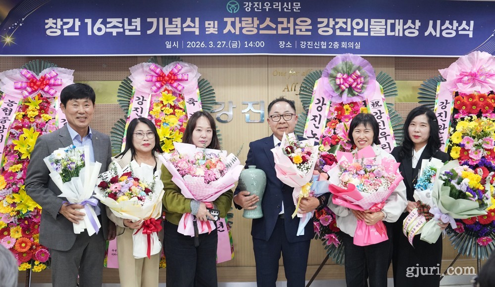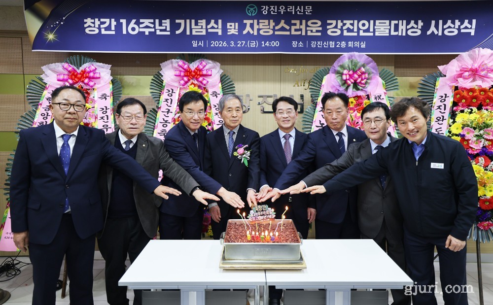 강진우리신문이 창간 16주년을 맞아 지난달 27일 오후 2시 강진신협 2층 대회의실에서 창간기념식 및 2026 자랑스러운 강진 인물 대상 시상식 그리고 강진군청&강진우리신문 MOU체결식을 성황리에 개최했다.
