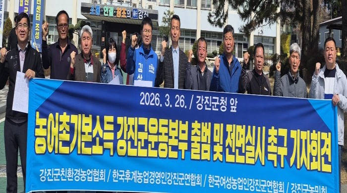 전남광주통합특별시 출범을 앞두고 강진관내 농민단체들이 기본소득 전면실시를 요구하는 기자회견을 가졌다.3월26일 강진군청 앞에서 열린 기자회견에는 강진군친환경농업협회, 한국후계농업경영인강진군연합회, 한국여성농업인강진군연합회, 강진군농민회 등 회원 15명이 참여하여 기본소득 강진군운동본부 출범을 알리며, 농업, 농민을 살리는 기본소득 정책을 전남광주 통합과 동..
