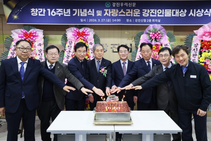 강진우리신문이 창간 16주년을 맞아 지난달 27일 오후 2시 강진신협 2층 대회의실에서 창간기념식 및 2026 자랑스러운 강진 인물 대상 시상식 그리고 강진군청&강진우리신문 MOU체결식을 성황리에 개최했다.이날 행사에는 오선옥 강진우리신문 회장, 이주연 대표이사를 비롯 강진원 군수, 서순선 군의회의장, 유경숙 군의회 운영위원장, 윤영남 의원, 노두섭..
