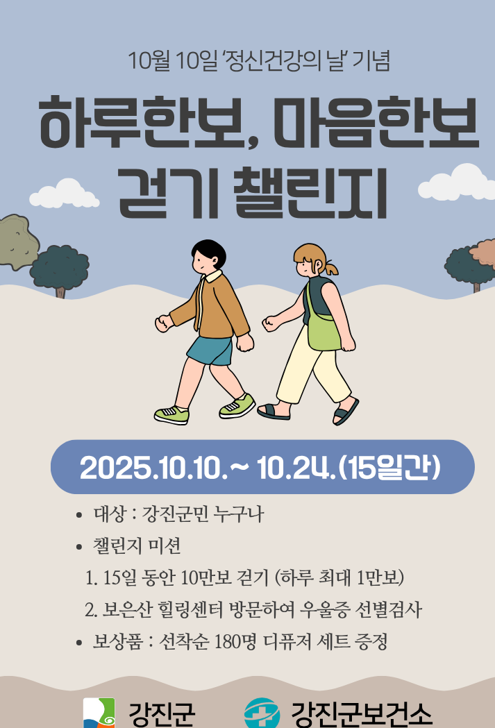 강진군보건소가 지난 10일 정신건강의 날을 기념해 군민 마음 건강을 위한 ‘하루 한보, 마음 한보 걷기 챌린지’를 운영중이다.이번 챌린지는 걷기를 통해 정신건강 행동 실천 수칙을 실천하며 신체 건강과 마음 건강을 동시에 지키자는 취지로 마련돼 오는 24일까지 진행된다.참여 방법은 ‘워크온(Walkon)’ 앱을 설치해 ‘강진군보건소 워크온 커뮤니티’에 가입 ..