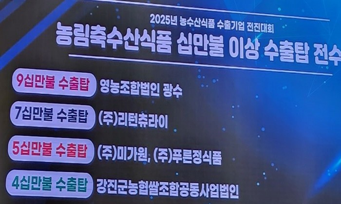 강진군의 어업회사법인 ㈜예원이 700만달러, 강진군농협쌀조합공동법인이 40만달러 수출탑을 각각 수상했다. 전남 농림축수산식품 수출탑은 수출액 10만달러 이상 달성하고, 전년대비 수출 증가율이 10% 이상을 기록한 기업을 선정해 시상한다.이번 수상은 지역 농수산식품의 품질과 경쟁력이 해외 시장에서 다시 한번 인정받은 의미 있는 성과로 평가된다. 시상식은 지난..