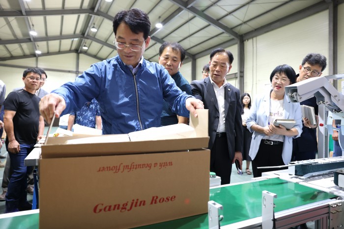 지난 22일 강진군이 마련한 ‘장미 직거래 포장박스 제함기 시연회’ 현장. 박스가 자동으로 접히고, 장미가 담긴 후 테이핑과 라벨 부착까지 일괄 처리되는 모습에 농업인들의 눈길이 쏠렸다.이날 시연회에는 강진원 군수를 비롯해 강진군 농업기술센터 관계자, 땅심화훼영농조합법인 회원 등 30여 명이 참석해 농업 현장에 자동화 기계 도입을 통해 직거래 유통 기반을 ..