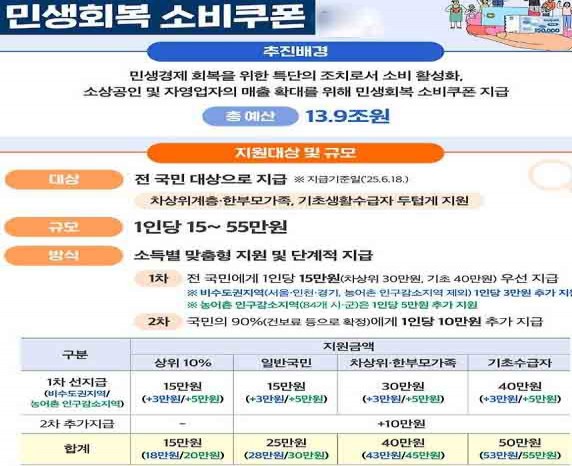 정부의 민생경제 활력 회복 정책에 따라 지난 21일부터 ‘민생회복 소비쿠폰’이 지급을 시작했다. 이번 사업은 고물가와 경기 둔화로 어려움을 겪는 군민의 생활 안정을 도모하고, 지역 내 소비를 활성화하기 위해 시행되는 범정부 차원의 지원책이다. ▶신청 및 지급 등 내용과 절차이번 1차 지급은 전 국민을 대상으로 하며, 강진군은 농어촌 인구감..