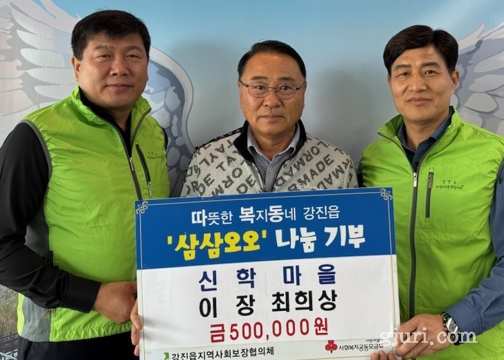 • 강진읍지역사회보장협의체(공동위원장 정명흥, 임창복)에서 주관하는 ‘삼삼오오 착한 기부 나눔 릴레이’에 최희상 신학마을 이장과 최영수 옥치마을 이장, 박성희 호산마을 이장, 천유석 학산마을 이장, 이범선 강진읍 이장단 단장, 박대현 강진농협 이사, 김종유 팔영마을 이장, 최광수 장동마을 이장이 각각 50만 원씩을 기탁하며 이웃사랑의 뜻을 전했다.
