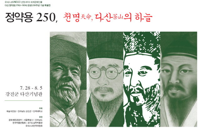 - 천명 天命, 다산 茶山의 하늘 -   전남 강진군(군수 강진원), 예술의 전당, 단국대학교가 공동 주최하고 문화체육관광부가 후원하는 다산 정약용(茶山 丁若鏞 1762~1836) 탄생 250주년 기념 특별전시회가 강진군 다산기념관에서 대한민국 대표축제인 제40회 강진청자축제 기간(7.28~8.5)동안 열린다.   유네스코(UNES..