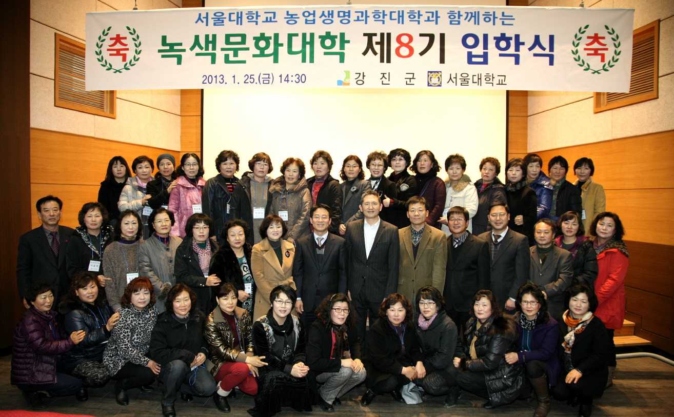 전남 강진군과 서울대학교가 지난 2005년 말부터 개설 운영하고 있는 녹색문화대학(학장 김성일)이 지난 25일 강진군농업기술센터 대강당에서 제8기 입학식을 가졌다. 이날 열린 입학식에는 강진원 강진군수를 비롯한 기관단체장과 수료생, 제8기 입학생 189명 등 210여명이 참석했다. 강진원 강진군수는 인사말에서 “이번 녹색문화대학에 이장님과 여..