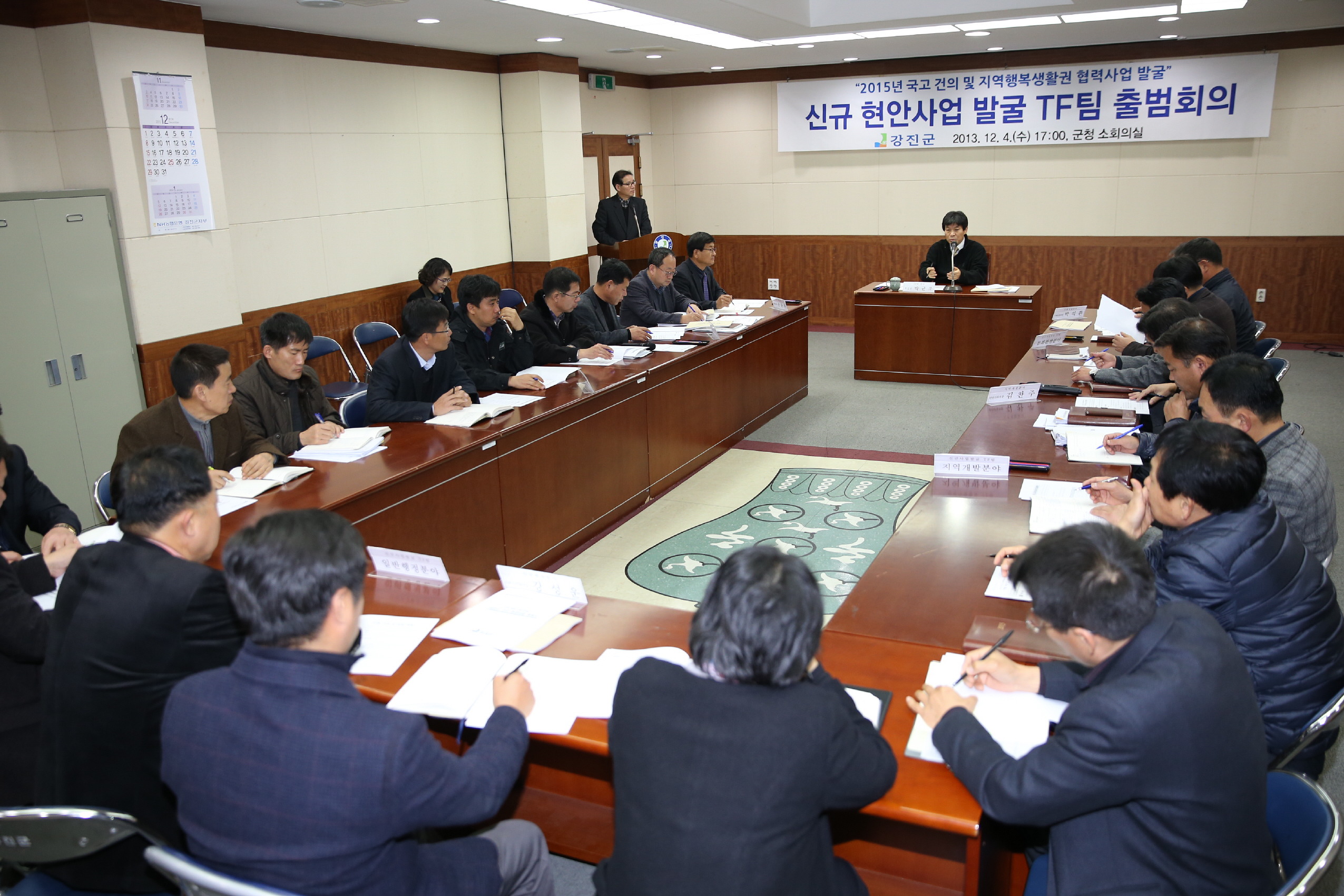 전남 강진군이 내년 정부예산 편성에 선제적으로 대응해 2015년도 국비를 확보하고자 ‘신규 현안사업 발굴 TF팀’을 구성하고, 지난 4일 군청 소회의실에서 공식 출범회의를 갖는 등 발 빠른 행보를 시작했다. 이날 출범회의는 박균조 부군수가 TF팀 단장으로서 회의를 주재하고, 총괄반장으로 윤순학 기획홍보실장과 기획·예..