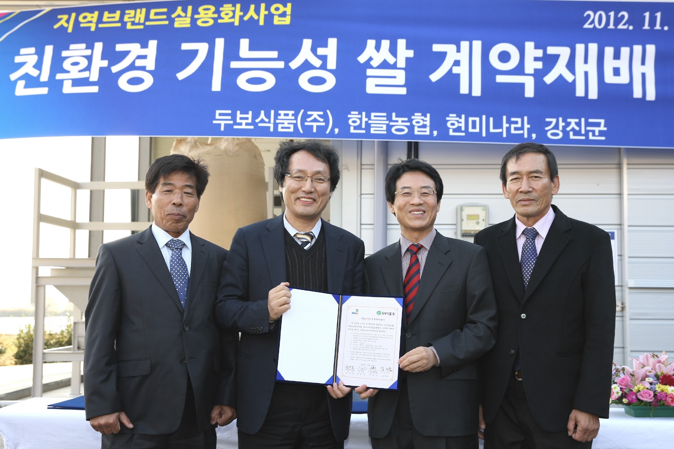 전남 강진군이 지난 19일 병영면 현미나라영농조합법인(두보식품 강진산지유통센터)에서 쌀 계약재배 농업인 100여명이 참석한 가운데 강진군․한들농협․두보식품(주)․현미나라영농조합법인 4자간 친환경 기능성 쌀 계약재배 협약서를 체결했다. 이번 협약은 강진군농업기술센터에서 역점적으로 추진하고 있는 친환경 기능성 쌀 계약재배 사업..